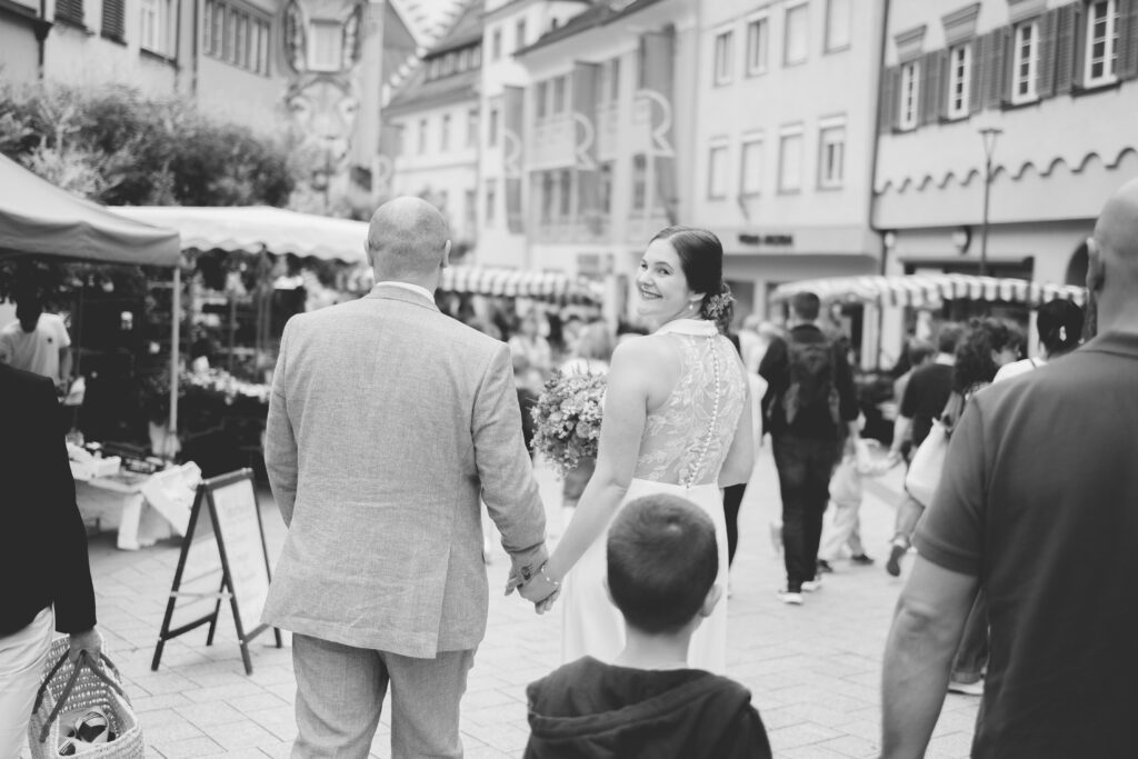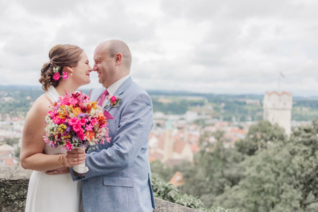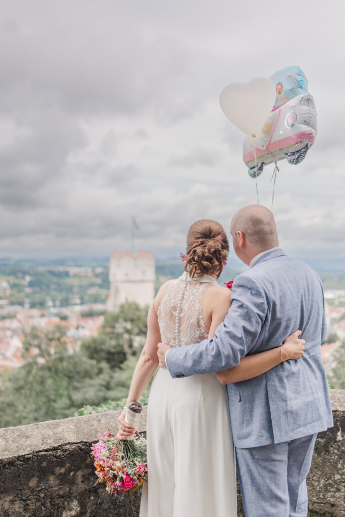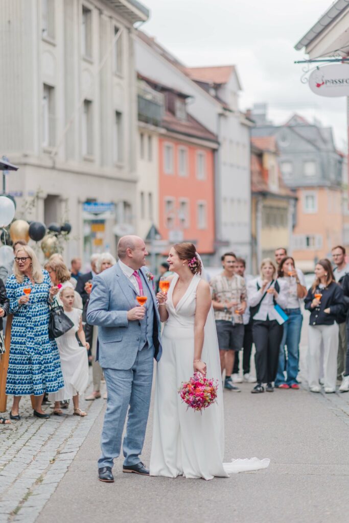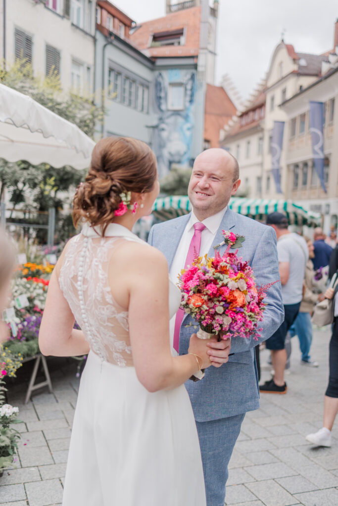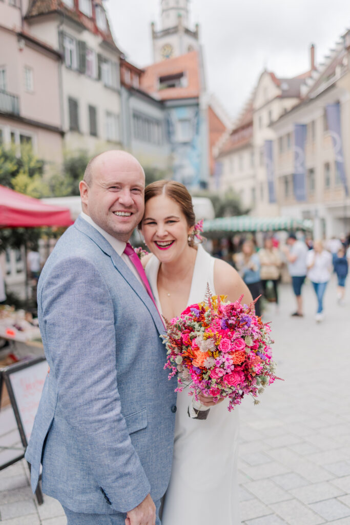 Bunt, fröhlich, herzlich und ausgelassen…so war die Stimmung bei der standesamtlichen Trauung im Turmzimmer der Veitsburg Ravensburg im Juli. Der gleiche Ort und das gleiche Datum wie bei meiner eigenen standesamtlichen Trauung – das konnte nur passen und war definitiv ein match. Einen super leckeren Sektempfang vom Atelier Tian nach der Trauung und dann ging’s über den Wochenmarkt in Richtung Innenstadt zur kirchlichen Trauung in der St. Jodoks Kirche. Danach ein zufälliges Strassenfestival mit einer Brass-Band vor dem Café nero mit leckeren Häppchen und schönen Aperitifen. Eine der wenigen Hochzeiten bei denen ich einfach etwas länger geblieben bin weil es so eine wundervolle Stimmung war. Danke euch zwei Herzenswünschen für diesen tollen Tag. Und schaut euch bitte diesen wundervollen Brautstrauss von der Wunderkammer in der Ravensburger Innenstadt an.