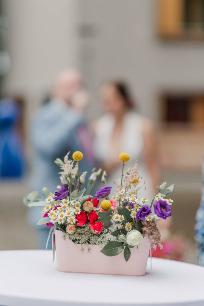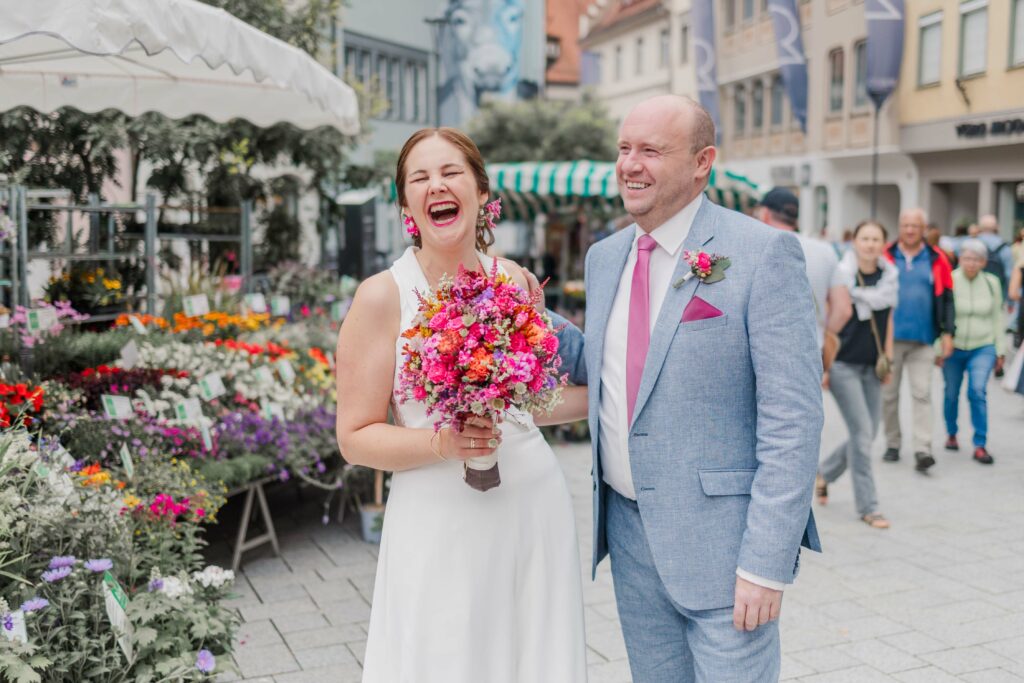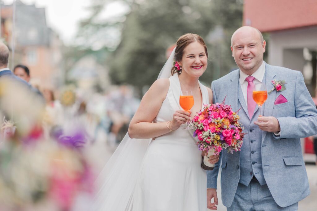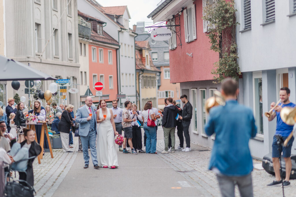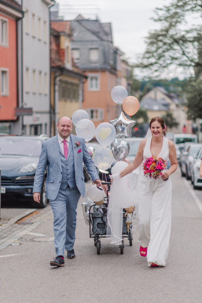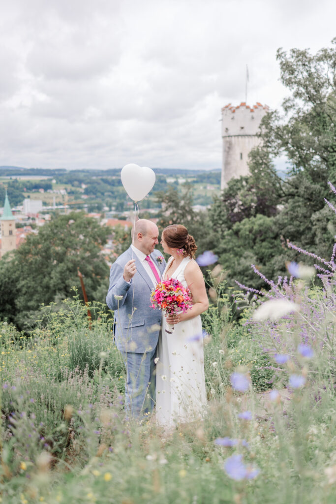 Bunt, fröhlich, herzlich und ausgelassen…so war die Stimmung bei der standesamtlichen Trauung im Turmzimmer der Veitsburg Ravensburg im Juli. Der gleiche Ort und das gleiche Datum wie bei meiner eigenen standesamtlichen Trauung – das konnte nur passen und war definitiv ein match. Einen super leckeren Sektempfang vom Atelier Tian nach der Trauung und dann ging’s über den Wochenmarkt in Richtung Innenstadt zur kirchlichen Trauung in der St. Jodoks Kirche. Danach ein zufälliges Strassenfestival mit einer Brass-Band vor dem Café nero mit leckeren Häppchen und schönen Aperitifen. Eine der wenigen Hochzeiten bei denen ich einfach etwas länger geblieben bin weil es so eine wundervolle Stimmung war. Danke euch zwei Herzenswünschen für diesen tollen Tag. Und schaut euch bitte diesen wundervollen Brautstrauss von der Wunderkammer in der Ravensburger Innenstadt an.